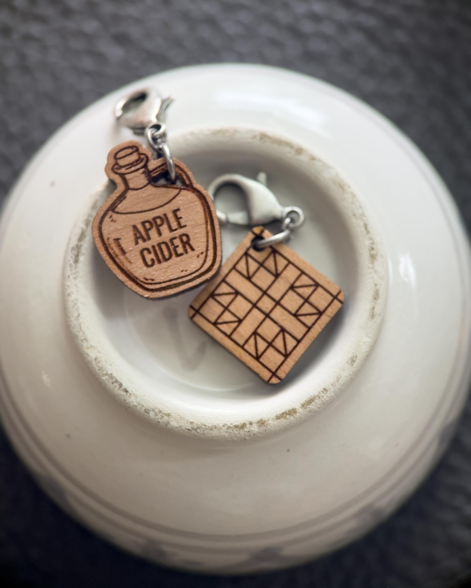 A 2 piece set of handmade beaded stitch markers with charm. Cherry wooden charms were a creative collaboration between Sassafras Knits and Twin Mountain Handmade.