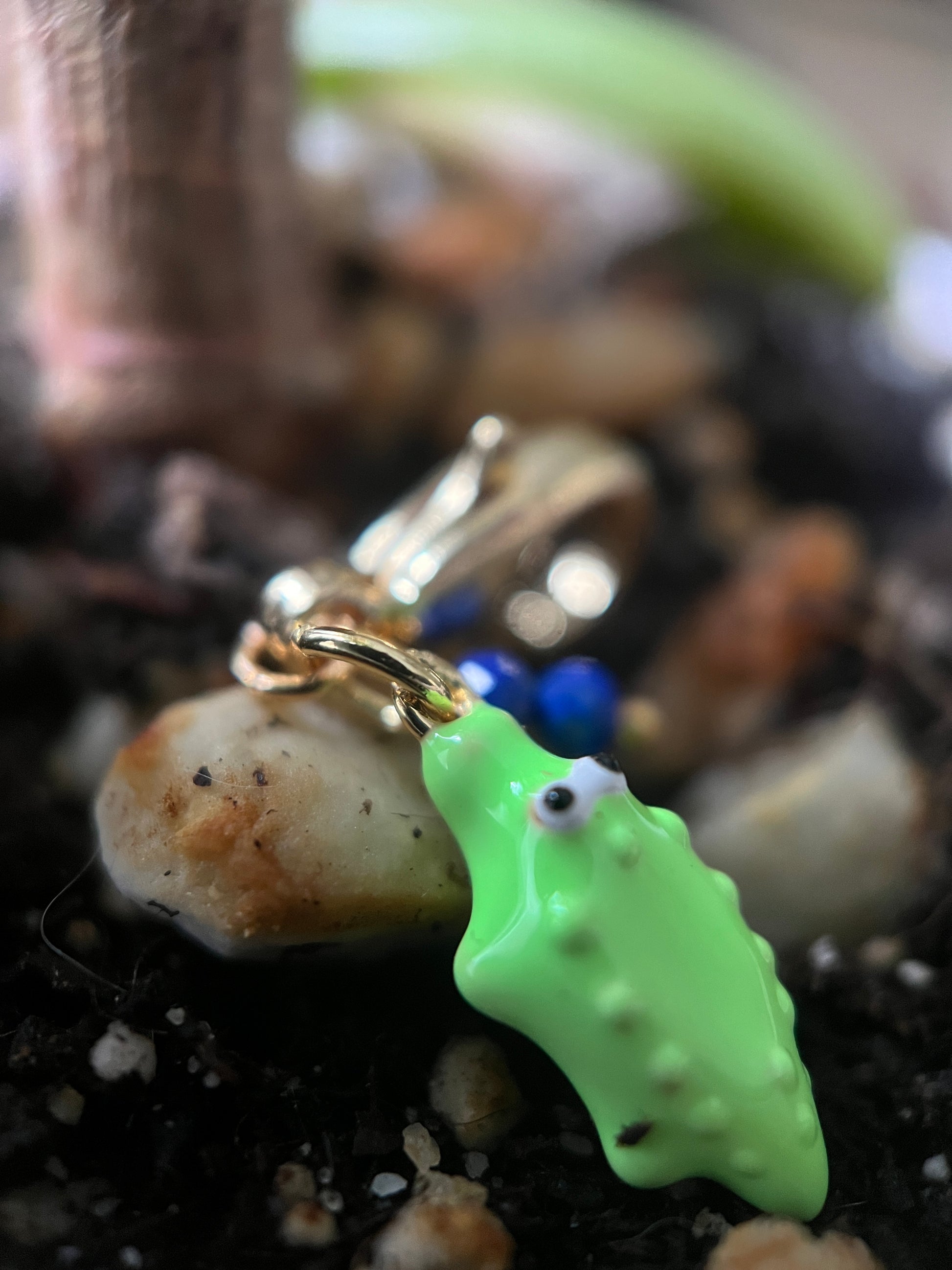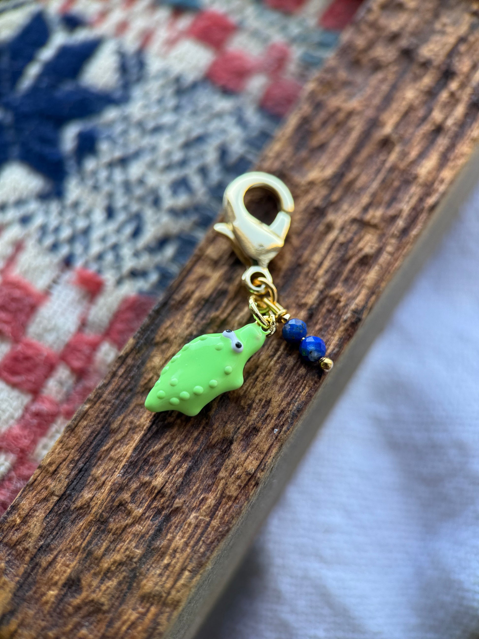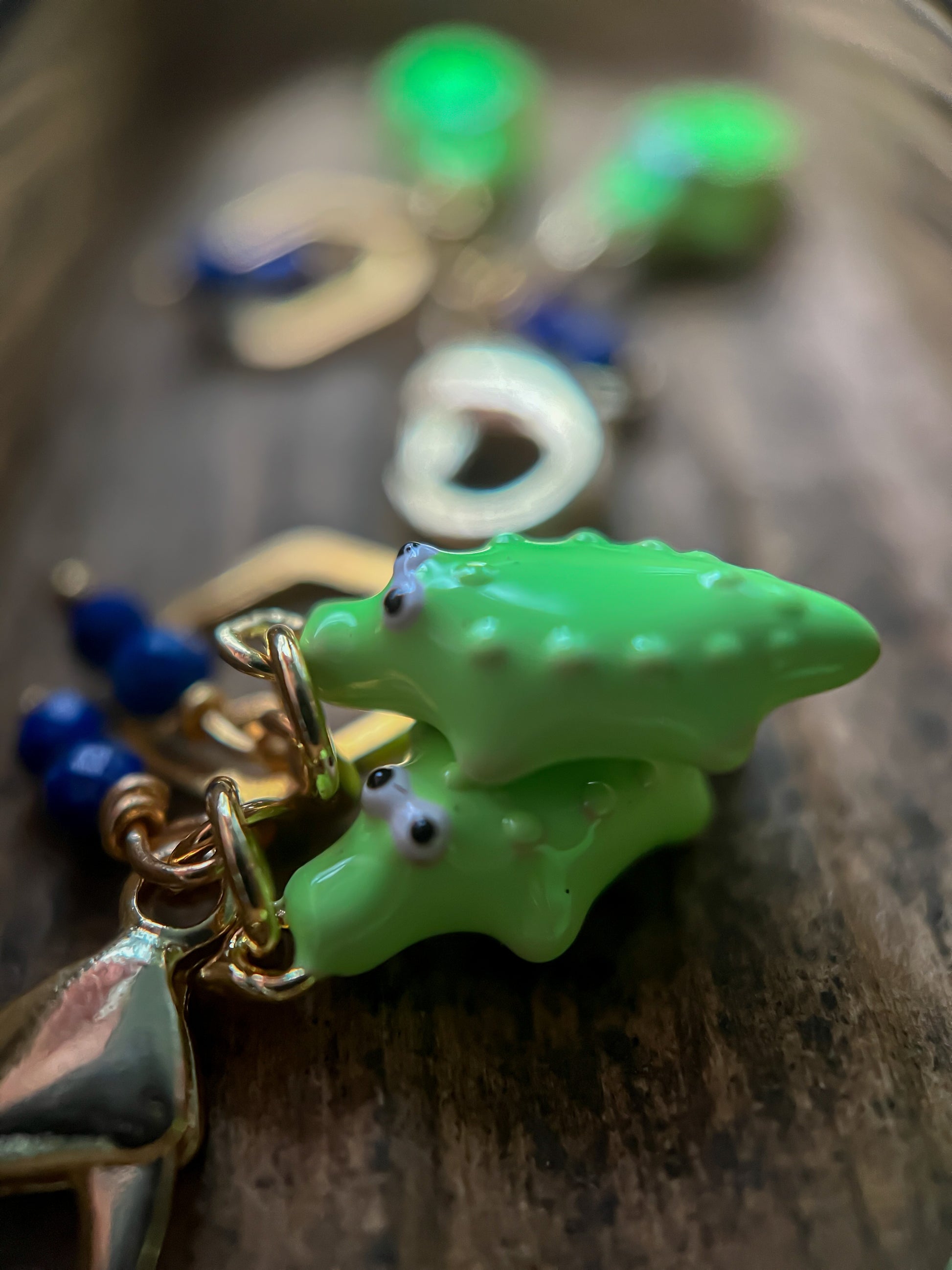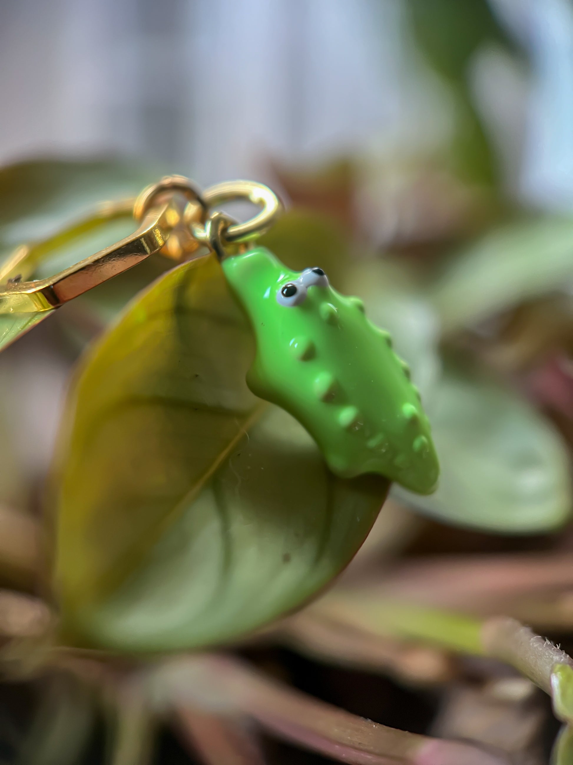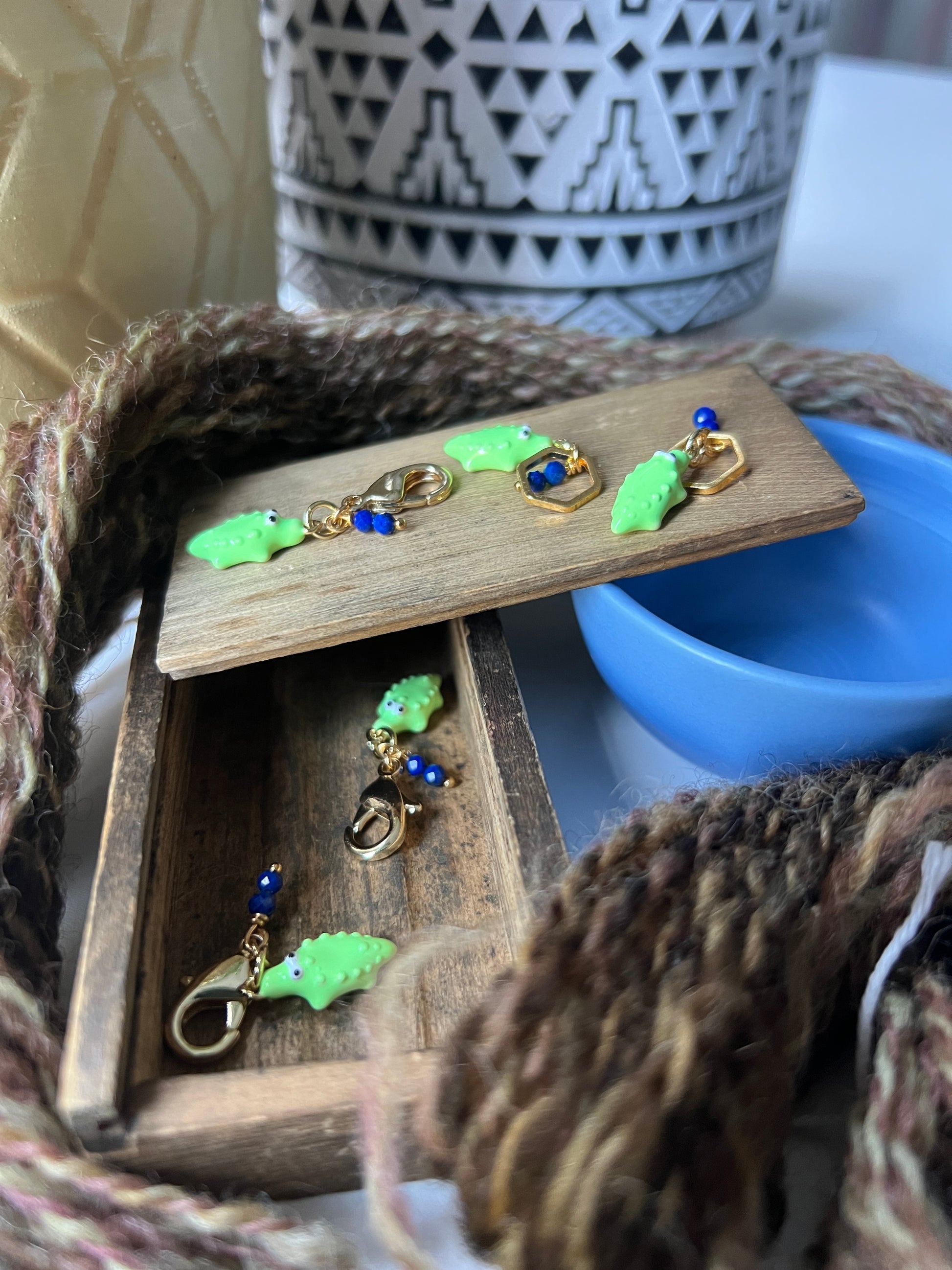 Add a delightfully squashed alligator to your knitting notions. He's bright green but not mean.