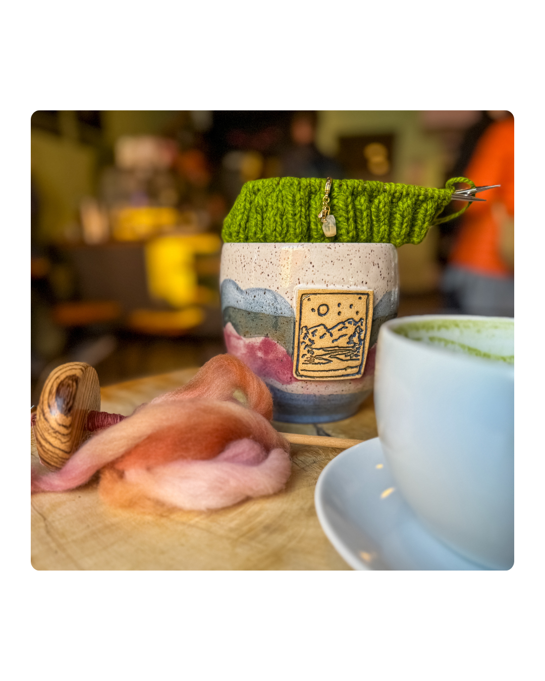 A handcrafted yarn bowl, carefully crafted and adorned with a Sassafras Knits stamp, provides both comfort and beauty. No holes or twisted openings necessary for this vintage bowl replication, as the design features a scenic river flowing towards the mountains, with the moon and stars shining above.