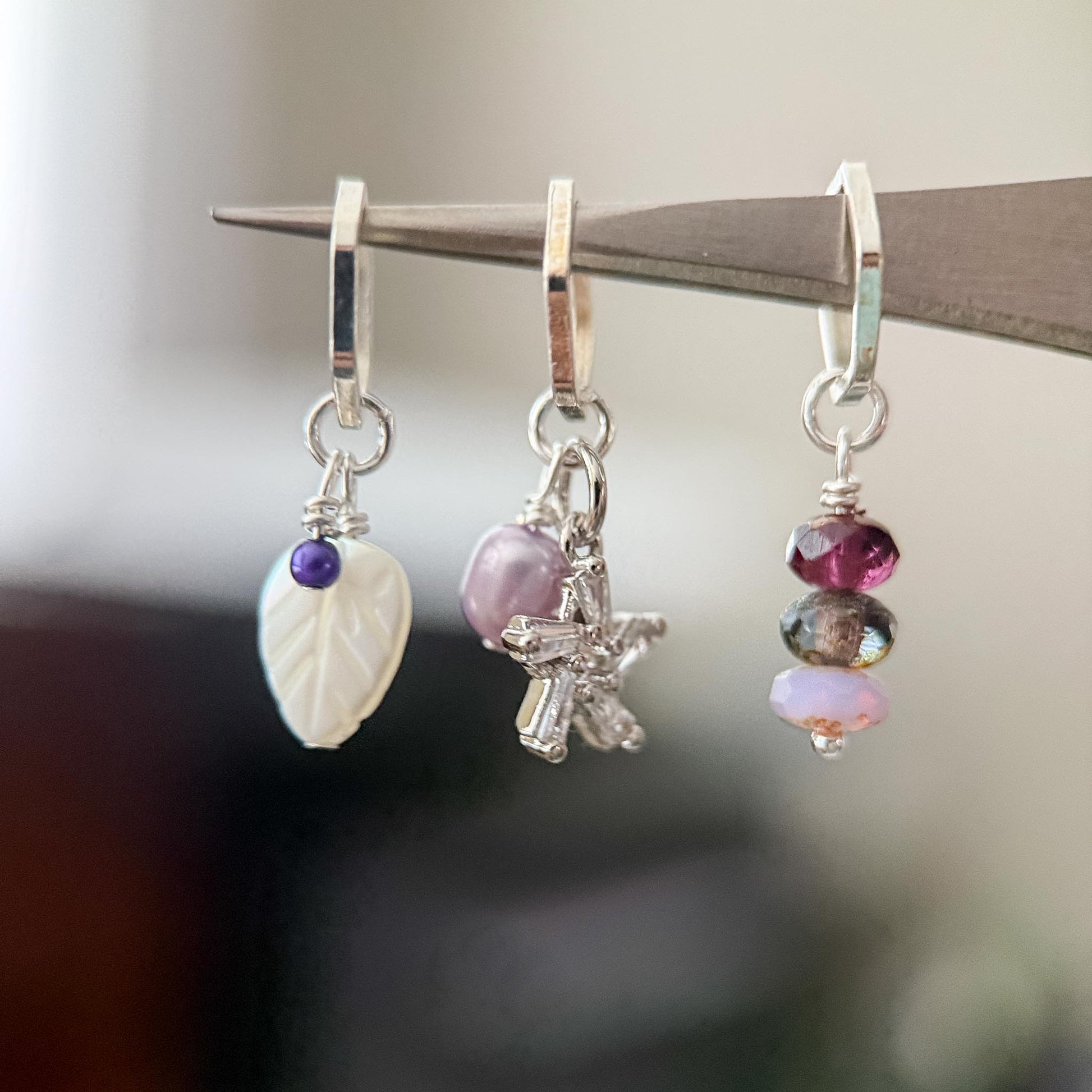 A 3 - piece set of handmade beaded stitch markers with charms. One lobster clasp and 2 hexagons.