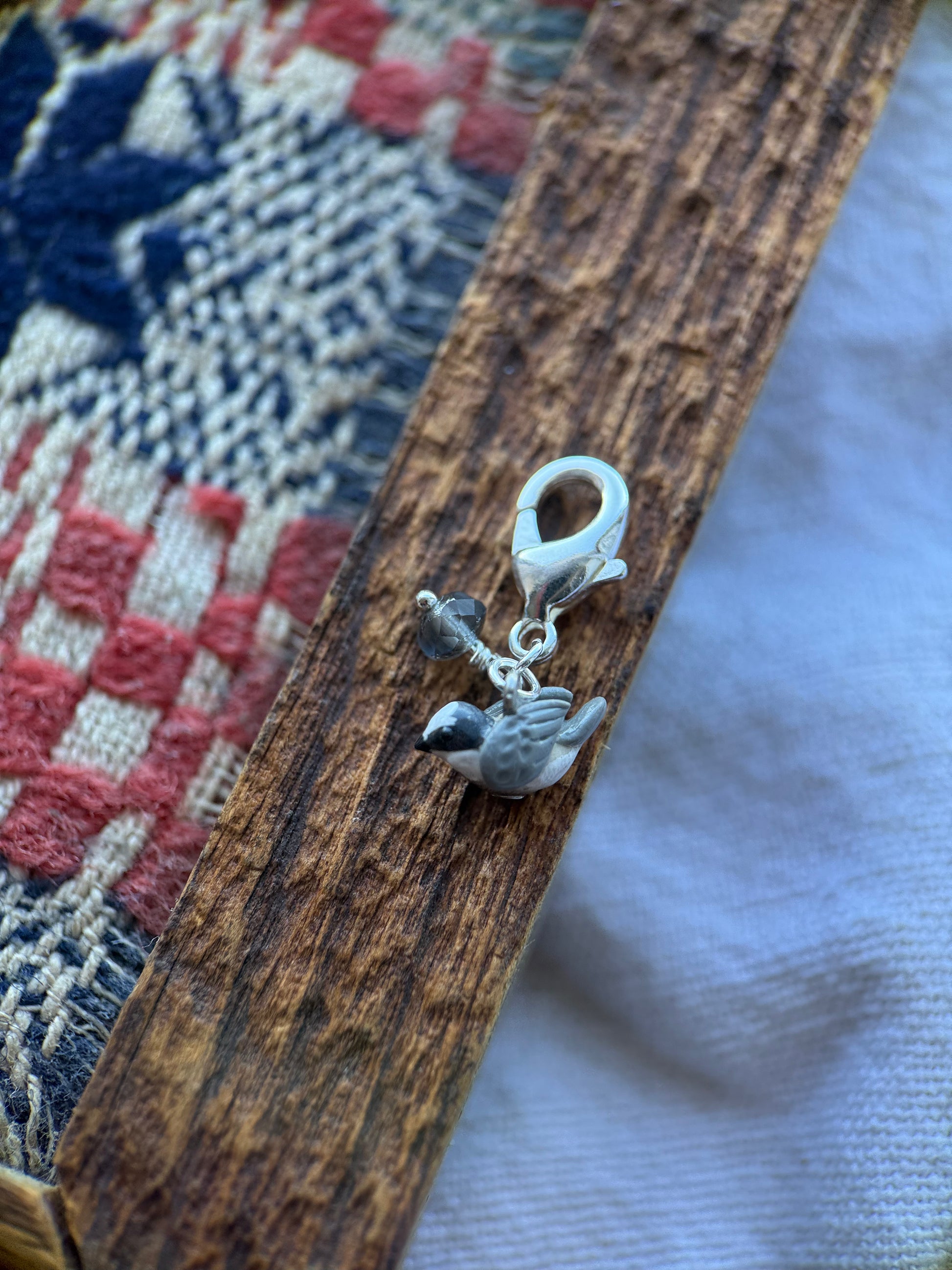 A handmade Canada Jay charm in collaboration with Katy of Lach & Lou.